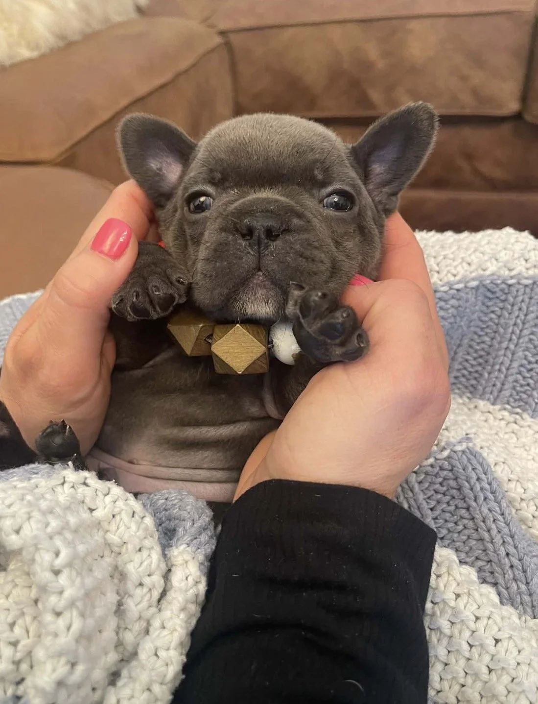 He has a calm, observant nature and loves being held close — a true little gentleman in the making. With his plush blue coat and perfect Frenchie features, he is simply irresistible.